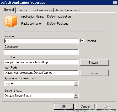 2. With all that in place, time to get the application ready. Access the App-V Management console, open the Default Application Properties. In the General tab, the OSD and Icon path must be using a UNC path, like in my case: “\\appv-server\content\”.