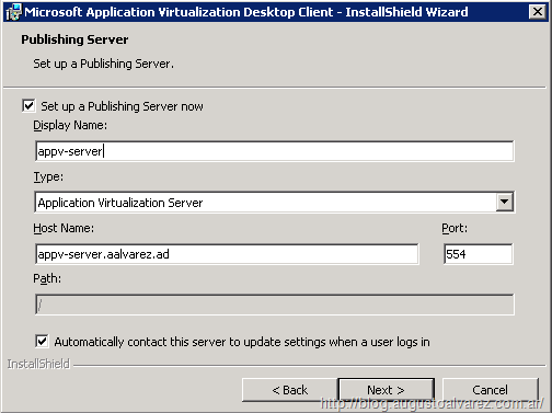 10. On "Publishing Server” complete the options used for your App-V Server. And since I won’t be using SSL for the communication, I’m selecting the type “Application Virtualization Server” and “Port” 554.