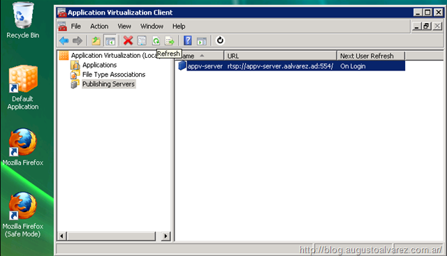 Access the client machine, and if you want to avoid the process of log-off and log-on to test it, locate the App-V Client console (C:\Program Files\Microsoft Application Virtualization Client\SftCMC.msc), select “Publishing Server” and click on “Refresh Server”.