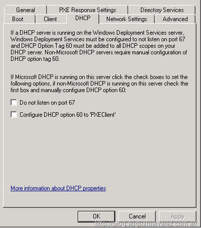 If we have the DHCP server on the same operating system running WDS, we’ll also need to access the WDS server properties and select on the DHCP tab both options: “Do not listen on port 67” and “Configure DHCP option 60 to ‘PXEClient’.