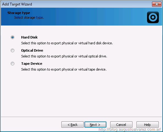 3.4 Since we are going to be using hard drives to present our storage, in “Storage Type” select “Hard Disk”, click on “Next”.