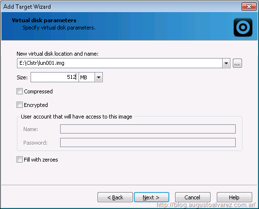 3.8 In the following screen, select the destination and size for the file we are creating. In my case, I’m using a separate drive where I’m going to save all of my LUNs.