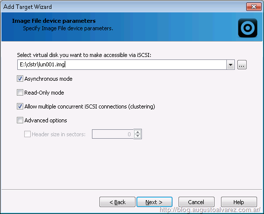 3.9 In the following options leave selected “Asynchronous mode” for the LUN, which will enable multithreaded disk operations (recommended for NTFS file system) and check “Allow multiple concurrent iSCSI connections (clustering)” which, of course, will provide the possibility for several hosts to be able to connect to this image file; click on “Next”.