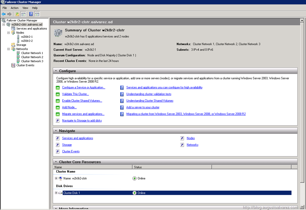 Now in our Failover Cluster console, we’ll get the complete picture about the cluster we’ve created: Nodes involved, storage associated to the cluster, networks and the events related to cluster.