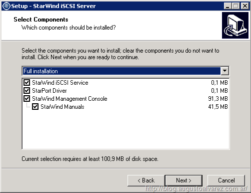 This way you can install the console on any machine compatible to access the server or servers with StarWind iSCSI and manage storage, permissions, etc. In this case, I’ll be selecting the full installation.