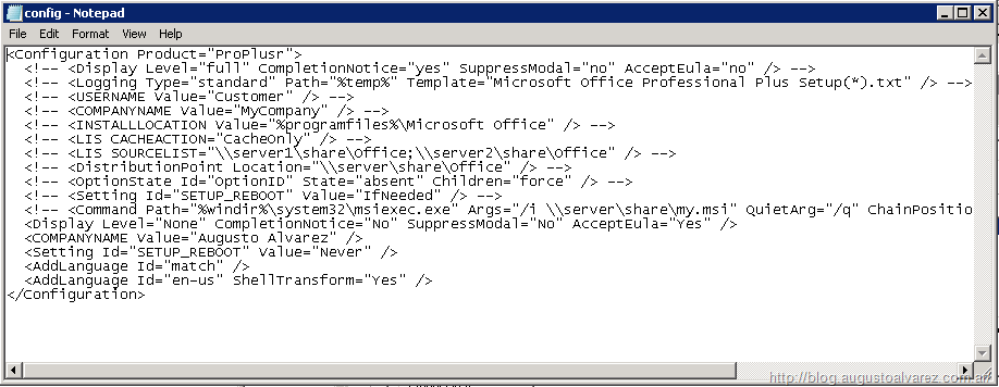 All these options are stored in one file: Config.xml; which is used of course as an answer file for the unattended installation for Office 2010. In this file we must also set the features we would like to install, and the type of installation.