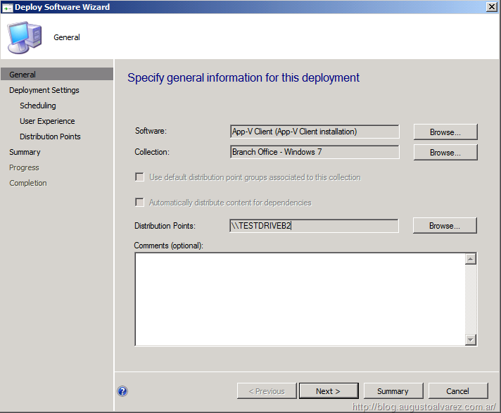 2. Select the “Collection” of devices where we would like to deploy this app, and also use the distribution point associated from which the clients will retrieve this application. In this example, “Distribution Point” is used with the SCCM 2012 Beta 2 installed “TESTDRIVEB2”.