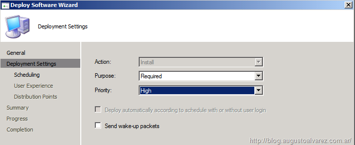 10. In “Deployment Settings” we can configure how to deploy this package: “Available” is used to let the package be available to the client and let the user decide when to install it; or “Required” which will automatically install the client.