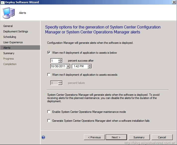 6. Deploying software also includes the possibility to manage the alerts regarding this process. We can configure this deployment to elevate alerts for SCCM and/or System Center Operations Manager (SCOM).